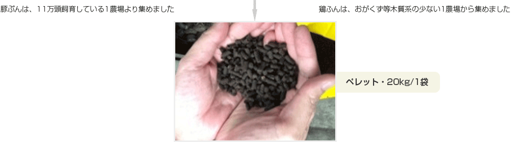- 原料豚ぷんは、ハイレベルな防疫体制が完備された役11万頭飼育している1農場由来です。